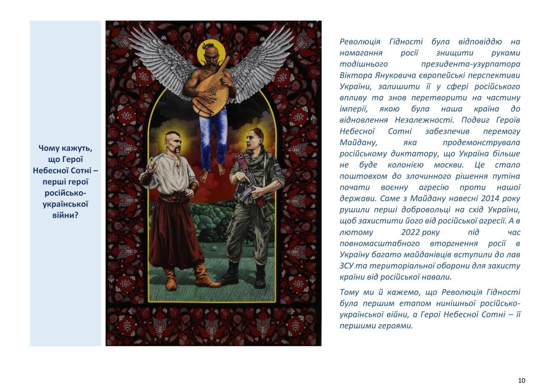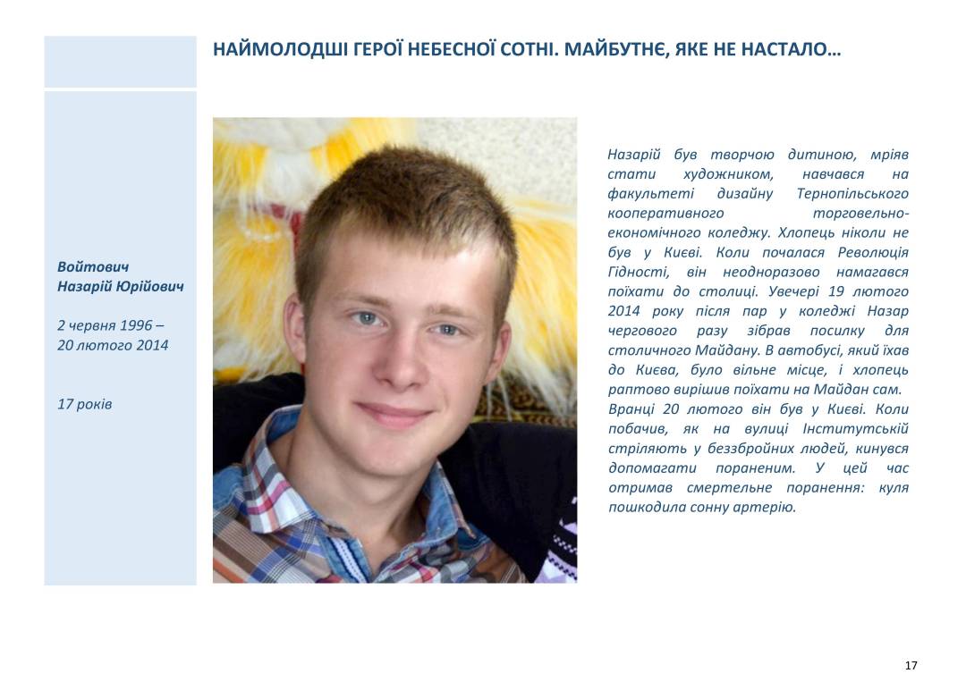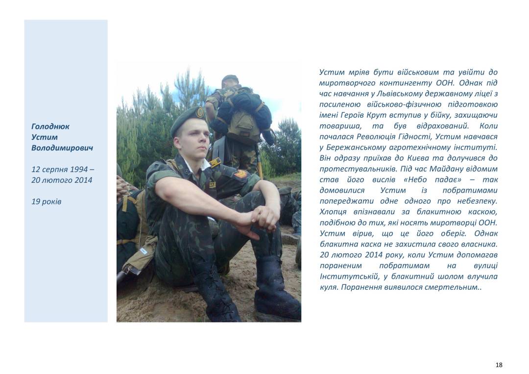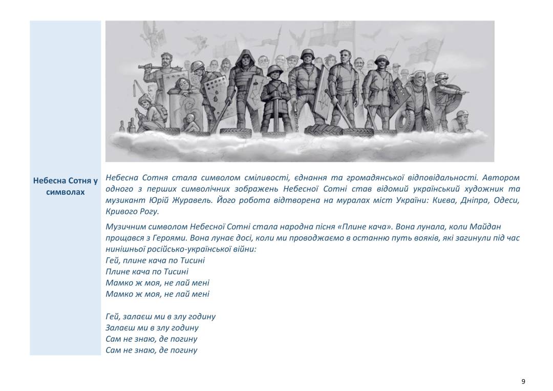 Високу ціну платить наша країна за право бути суб’єктом на карті світу та мати власні суверенітет і державність. Одними з перших, які рішуче виступили на захист нашої Батьківщини, були Герої Небесної Сотні. Вони стали символом світла та перемоги над злом. Разом із героями теперішньої Війни за Незалежність України, які відстоюють на фронті наше право жити у вільній соборній Україні, вони живлять та зміцнюють нашу віру в Перемогу.