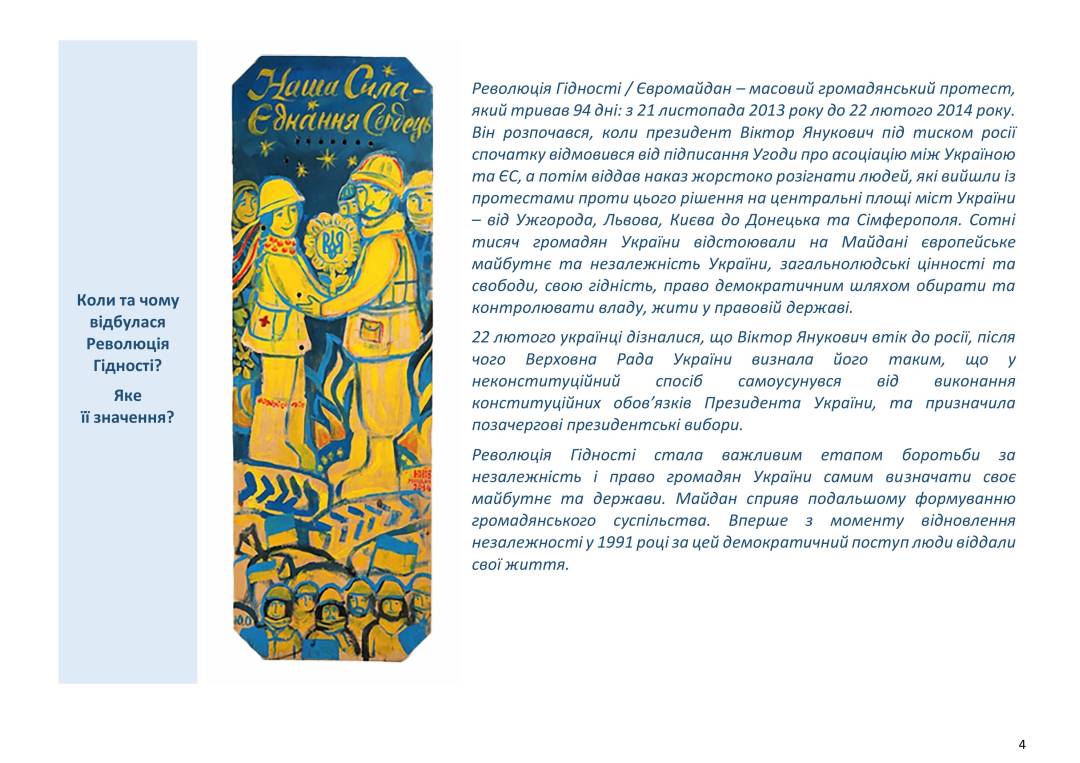 Революція Гідності — масовий громадянський протест, який тривав 94 дні — з 21 листопада 2013 року до 22 лютого 2014 року. Його було спричинено різкою зміною зовнішньополітичного курсу та вектора розвитку держави, а згодом антиконституційними діями влади. Центром подій стали столичний майдан Незалежності та навколишні вулиці — Хрещатик, Михайла Грушевського, Інститутська. Мирні акції почалися під євроінтеграційними гаслами, але згодом перетворилися на тривалу кампанію громадянської непокори владному режиму президента Віктора Януковича — проти корупції та порушення прав людини. Дії влади, спрямовані на придушення протестів силовим шляхом, призвели до ескалації конфлікту та людських жертв.