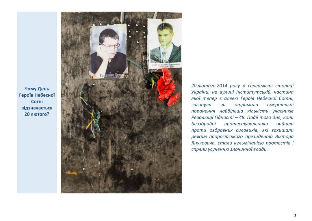 День Героїв Небесної Сотні відзначають щорічно 20 лютого згідно з Указом Президента України «Про вшанування подвигу учасників Революції Гідності та увічнення пам’яті Героїв Небесної Сотні» від 11 лютого 2015 року № 69/2015 на знак пам’яті про громадян, які загинули під час Революції Гідності у боротьбі за ідеали демократії, права та свободи людини, європейське майбутнє України та завдяки яким було змінено перебіг історії нашої держави.