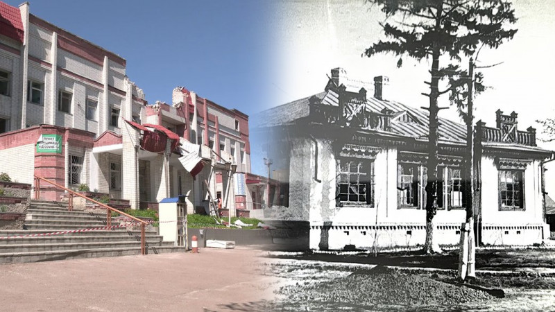 На колажі зображена будівля частково зруйнованої поліклініки Чернігівської районної лікарні та перша лікарня, яку відкрили у 1956 році, як Бобровицьку дільничну. Суспільне Чернігів