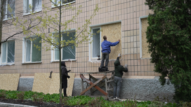 Забивають вікна ДСП після після російського ракетного удару 17 квітня 2024 року на території Чернігівської районної лікарні Суспільне Чернігів