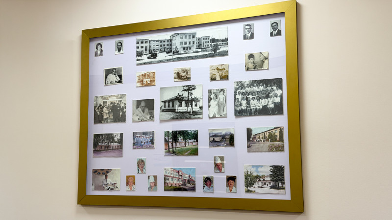 Стенд з архівними фотографіями, які вціліли з будівлі полікліники, тепер розташований в адміністративному корпусіна території лікарні Суспільне Чернігів