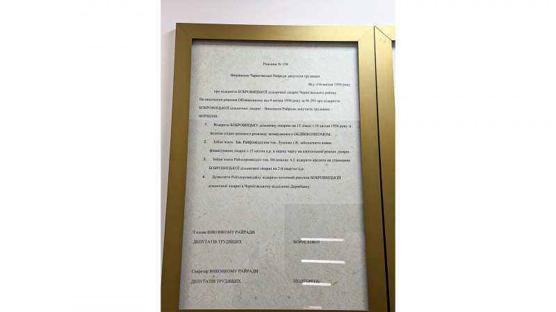 Стенд з рішенням виконкому Чернігівської райради про відкриття Бобровицької дільничної лікарні від 14 квітня 1956 року Суспільне Чернігів