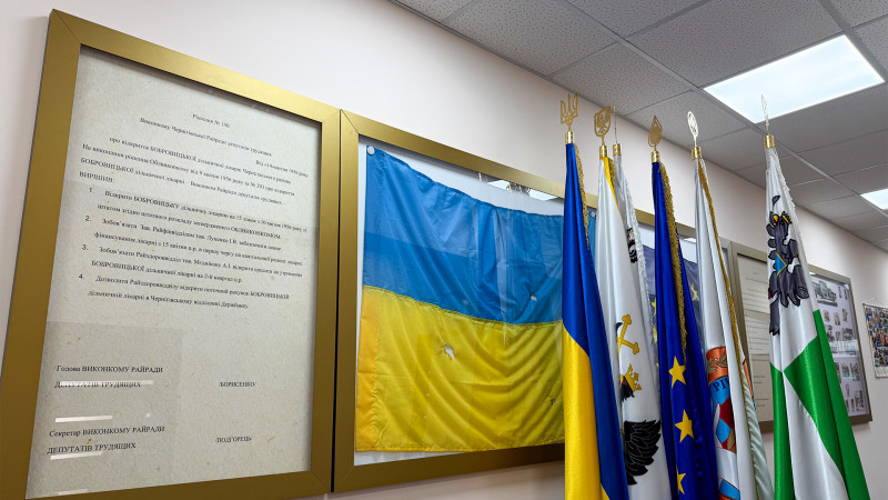 Стенд з рішенням виконкому Чернігівської райради про відкриття Бобровицької дільничної лікарні у 1956 році та прапорами Суспільне Чернігів