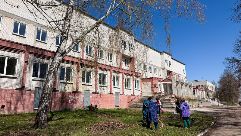 Біля поліклініки Чернігівської районної лікарні прибирають листя. 14 квітня 2026 рік Суспільне Чернігів