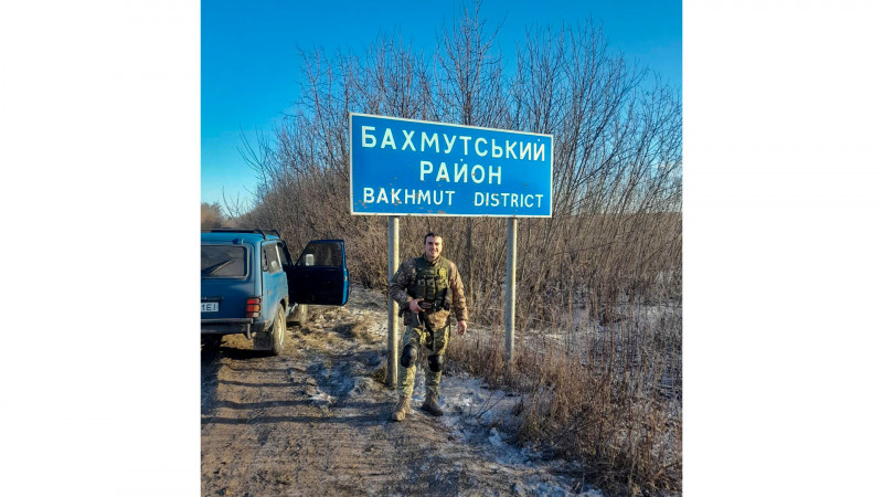Павло Павленко біля вказівника Бахмутський район З особистого архіву Павла Павленка
