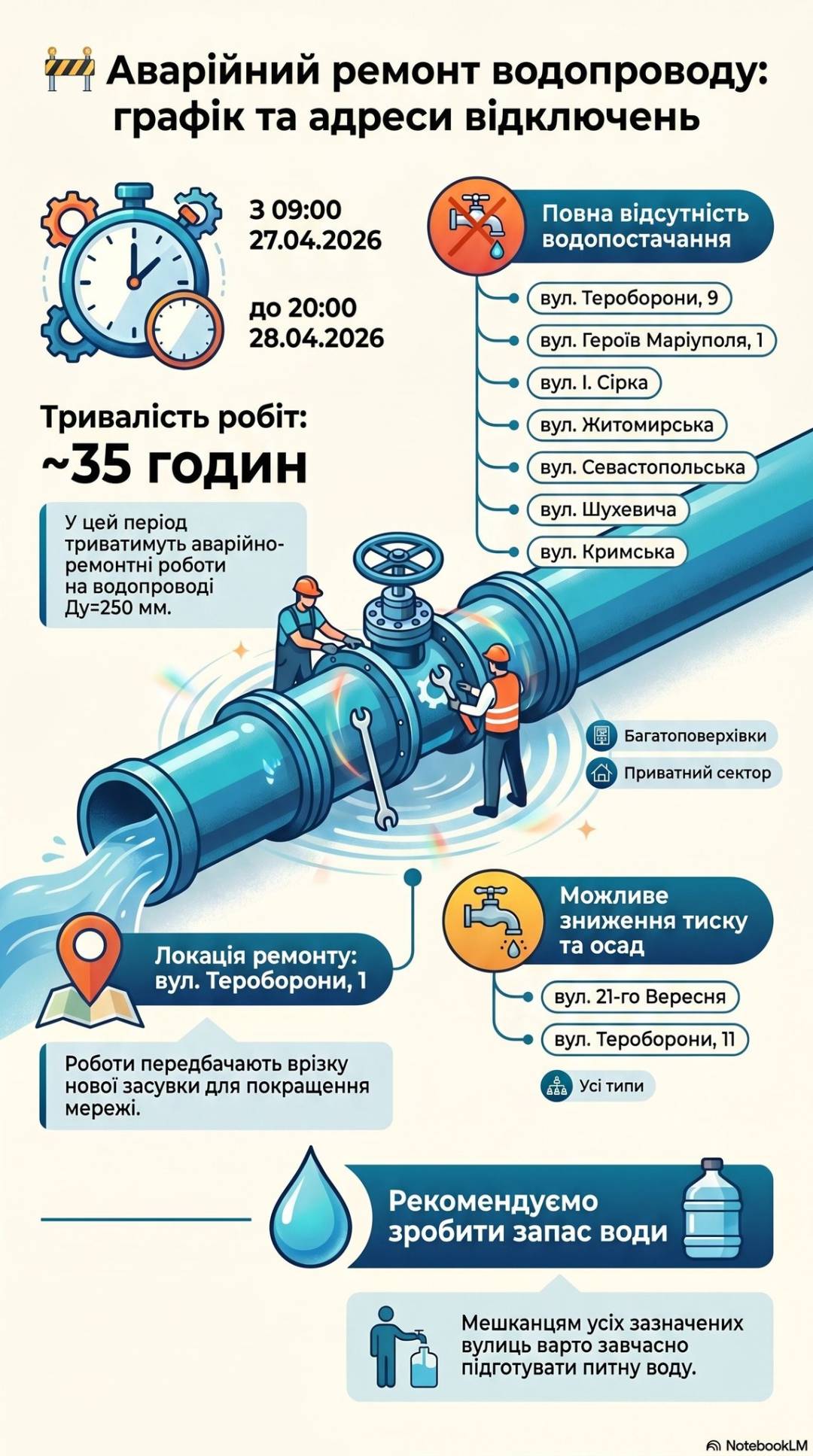 У зв’язку з проведенням аварійно-ремонтних робіт на водопроводі Ду=250 мм (врізка засувки) за адресою вул. Тероборони, 1 з 09:00 год. 27 квітня до 20:00 год. 28 квітня буде відсутнє водопостачання за низкою адрес.