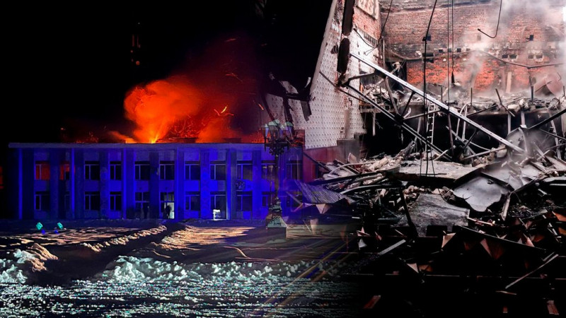 Пожежа та пошкодження будинку культури в Новгороді-Сіверському внаслідок атаки росіян в ніч на 30 січня 2026 року. Поліція Чернігівської області/Facebook-сторінка Олександра Селіверстова