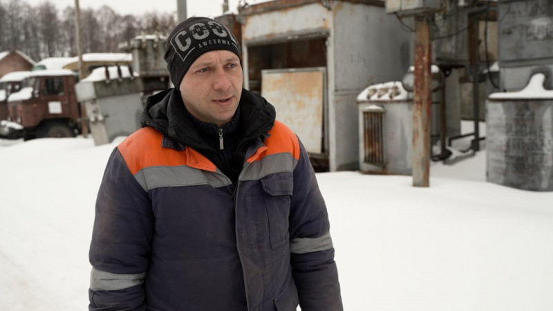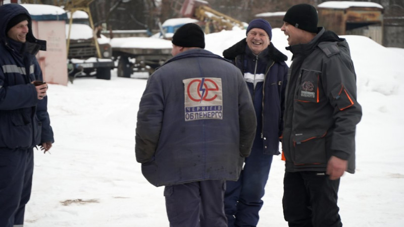 Електромонтер Микола Мельник з колегами – бригада Городнянської дільниці. ФОТО: Суспільне Чернігів "Висновок про їх (росіян – ред.) один… Ну, не можна такі слова говорити", – говрить Мельник.
