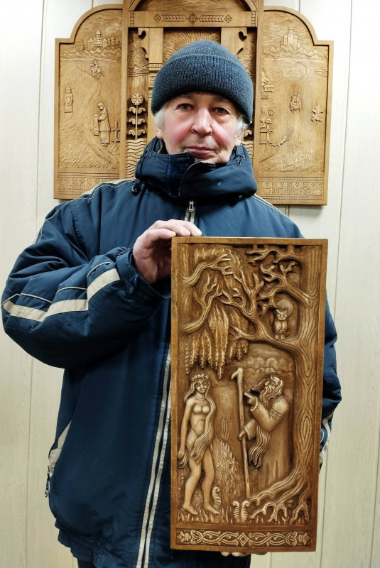 Ми вже розповідали, що впродовж січня різьбяр із Чернігівщини Анатолій Семенцов створив дві нові об’ємні пластини – «Солоха в церкві» та «Ой, ходила дівчина бережком». І оскільки майстер товаришує з Сосницьким літературно-меморіальним музеєм О.П.Довженка, то приносить до закладу свої роботи.
