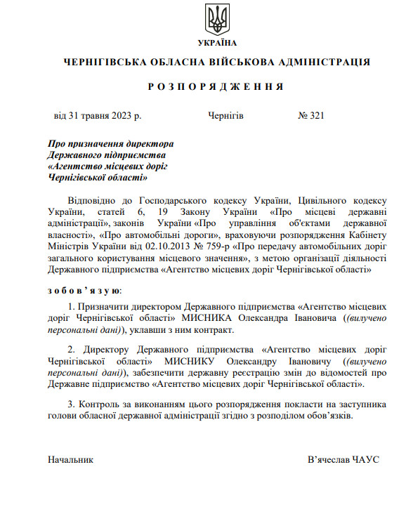 Директором Державного підприємства «Агентство місцевих доріг Чернігівської області» призначено Мисника Олександра Івановича.