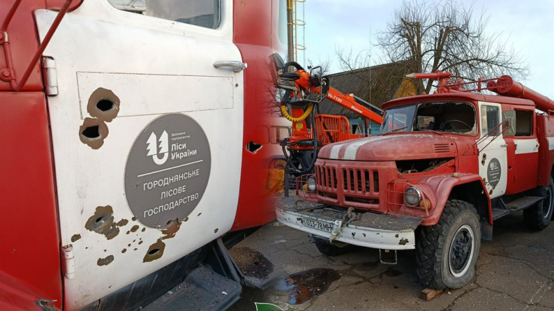 Залишки російського безпілотника на Чернігівщині. Філія «Північний лісовий офіс»"На території нижнього складу Городнянського надлісництва стався приліт безпілотного літального апарата. Унаслідок удару пошкоджена техніка підприємства, зокрема й пожежний автомобіль, який використовується для гасіння лісових пожеж. Серед працівників ніхто не постраждав", — йдеться у повідомленні.