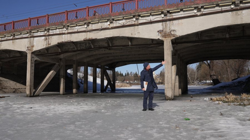 Сергій Леп’явко показує рівень води в районі Красного мосту у 2026 році. Суспільне Чернігів"На Красному мосту у тролейбусі нижня сходинка була затоплена. Це я пам’ятаю. І щоб зайти до тролейбуса, треба було стрибати. Було дуже багато води", — зазначає Василь.