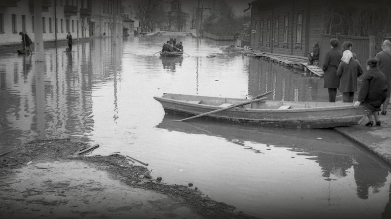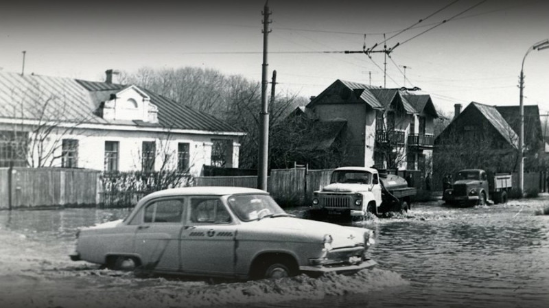 Човен на затопленій вулиці у Чернігові у 1970 році. Анатолій Яровед"У 1970-му вся вулиця була зайнята військовими БТРами, вони плавали вулицею. Майже у кожного був човен. Тоді дали човни. Дало «Хімволокно» свої човни. Там же в них база була за Десною".