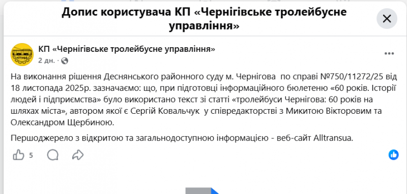 На сторінці КП «Чернігівське тролейбусне управління» у фейсбуці з’явилася публікація на виконання рішення Деснянського районного суду м. Чернігова у справі №750/11272/25 від 18 листопада 2025 року.
