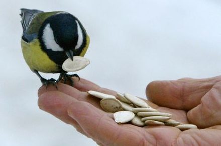 A Great Tit picks up a pumpkin seed from a man’s hand in a park in central Kiev January 30, 2006. REUTERS/Ivan Chernichkin