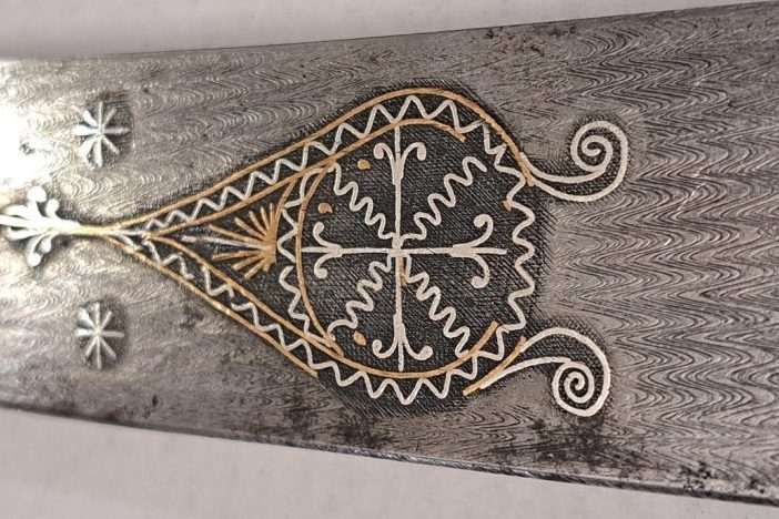Але ця шабля однозначно дорога, бо вона з прикрасами. Є відповідні елементи декору, візерунки, за якими можемо сказати, що річ близькосхідного походження. І важливо, що вона виготовлена з дамаської сталі, з якою працювали кваліфіковані майстри, яких було не так і багато», – розповів Максим Блакитний.