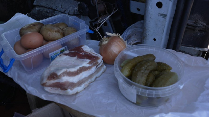 "У мене з собою у дорозі: картопелька, цибулька, сальце завжди різне є. Сьогодні ось таке, можна сказати «адідасовське»".