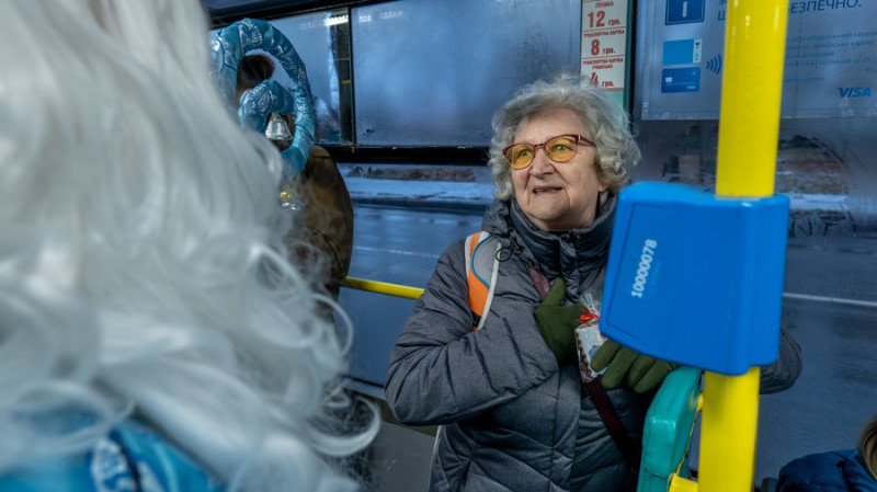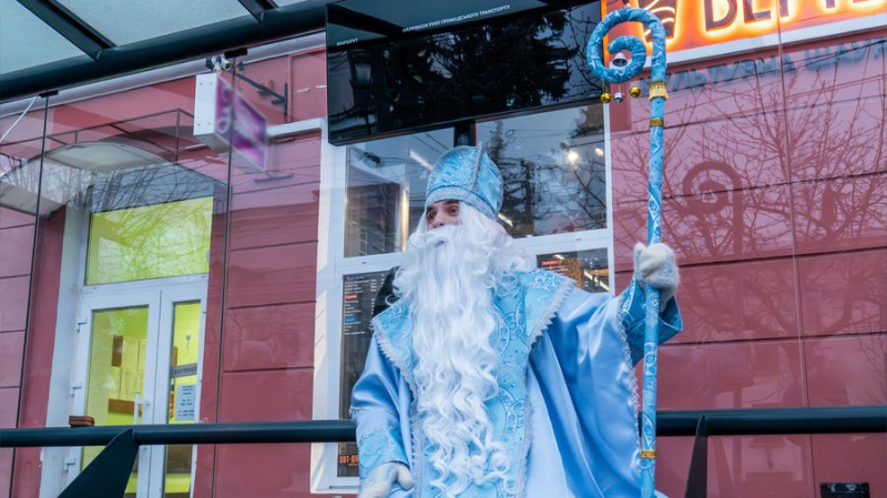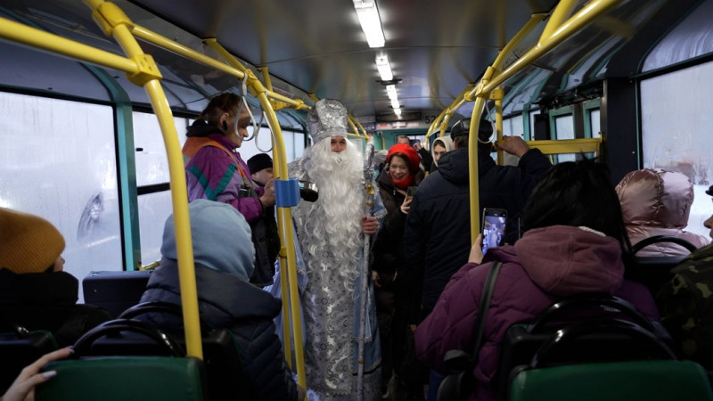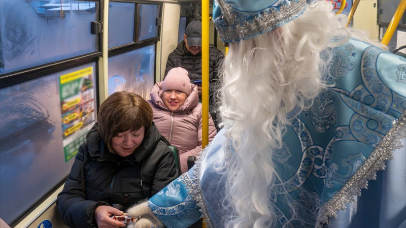 Святий Миколай роздає цукерки в одному з тролейбусів міста. Суспільне Чернігів/Даниїл Башаков