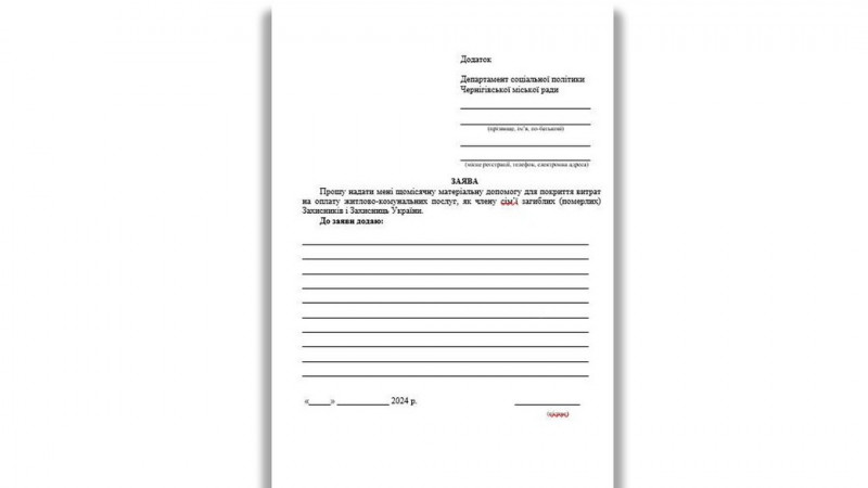 Для отримання щомісячної допомоги членам сімей загиблих чи померлих захисників і захисниць України, вони мають право звернутись із письмовою заявою до департаменту соціальної політики Чернігівської міськради.