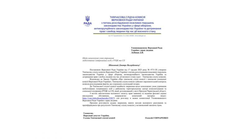 Згодом Олексій Гончаренко додав, що звернувся до уповноваженого Верховної Ради України з прав людини Дмитра Лубінця, щодо ситуації з умовами утримання мобілізованих в ТЦК у Прилуках.