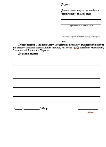 Для отримання щомісячної матеріальної допомоги членам сімей загиблих (померлих) Захисників і Захисниць України особа (або уповноважена особа) має право звернутись із письмовою заявою до департаменту соціальної політики Чернігівської міської ради (вул. І. Мазепи, 19).