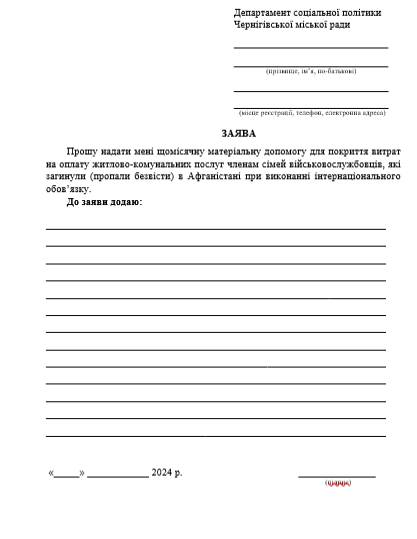Для отримання щомісячної матеріальної допомоги членам сімей військовослужбовців, які загинули (пропали безвісти) в Афганістані при виконанні інтернаціонального обов’язку, особа (або уповноважена особа) має право звернутись із письмовою заявою до департаменту соціальної політики Чернігівської міської ради.