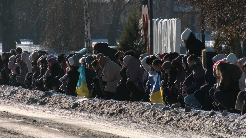 Люди навколішки прощаються з Михайлом Проценком. Суспільне Чернігів
