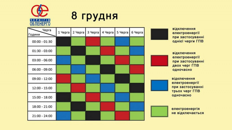 Графіки погодинних відключень електроенергії на Чернігівщині на 8 грудня. Чернігівобленерго
