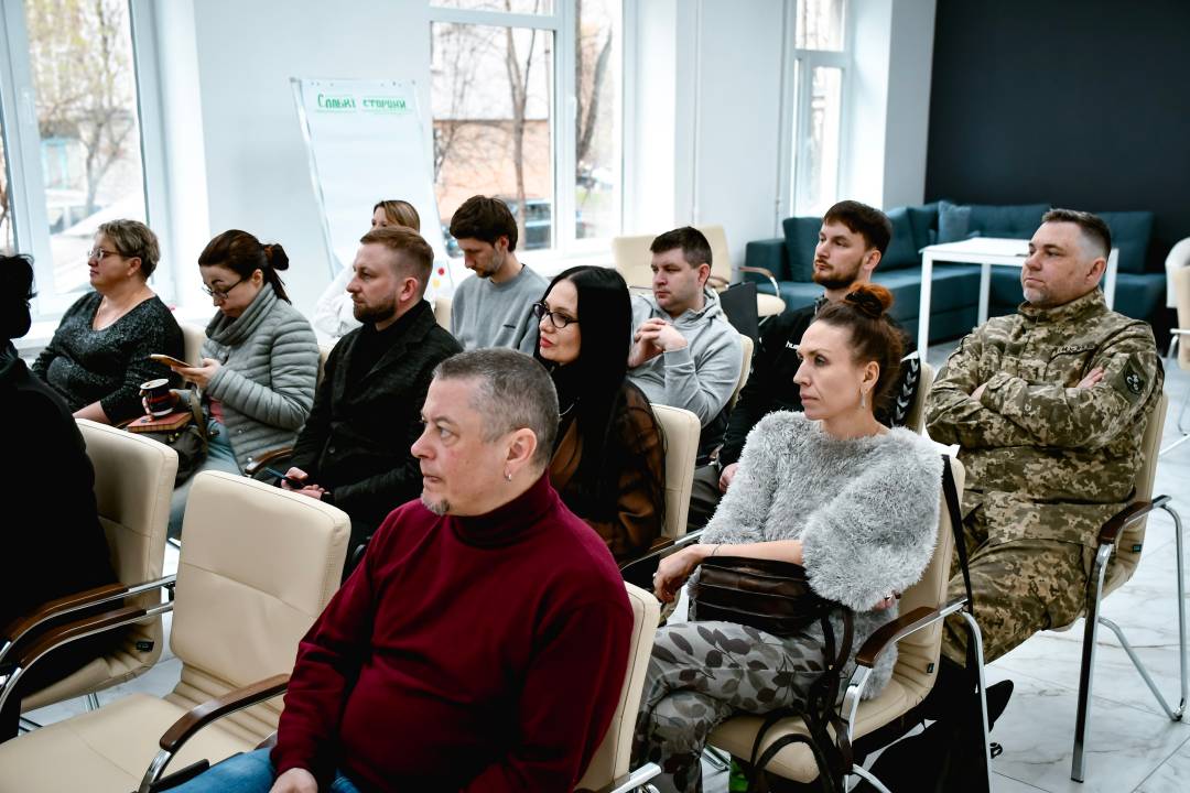 8 квітня на базі економічного хабу КНП «Ветеранський простір» відбулося відкрите обговорення в межах підготовки Стратегії за участі представників громадськості, бізнесу різних сфер та начальниці відділу міжнародних відносин та інвестицій міської ради Наталії Хольченкової. Зустріч була організована у форматі SWOT-аналізу, під час якого учасники визначали сильні та слабкі сторони громади, а також можливості розвитку і потенційні ризики.