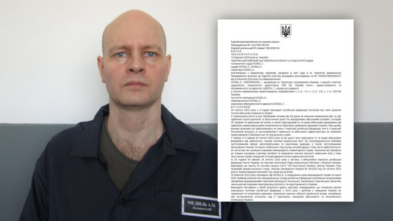 Засуджений уродженець Чернігова Андрій Медвідь, який хоче, щоб його обміняли до Росії, повідомляв про розташування військових об'єктів, Сил оборони України та підпалив релейну шафу. Про це йдеться у вироку Чернігівського районного суду, який розміщений в аналітичній системі YouControl. У суді чоловік повідомив, що співпрацював із росіянами, бо хотів оплатити навчання сину. Чоловіка засудили до 15 років ув'язнення, зокрема, за держзраду та вчинення диверсії.