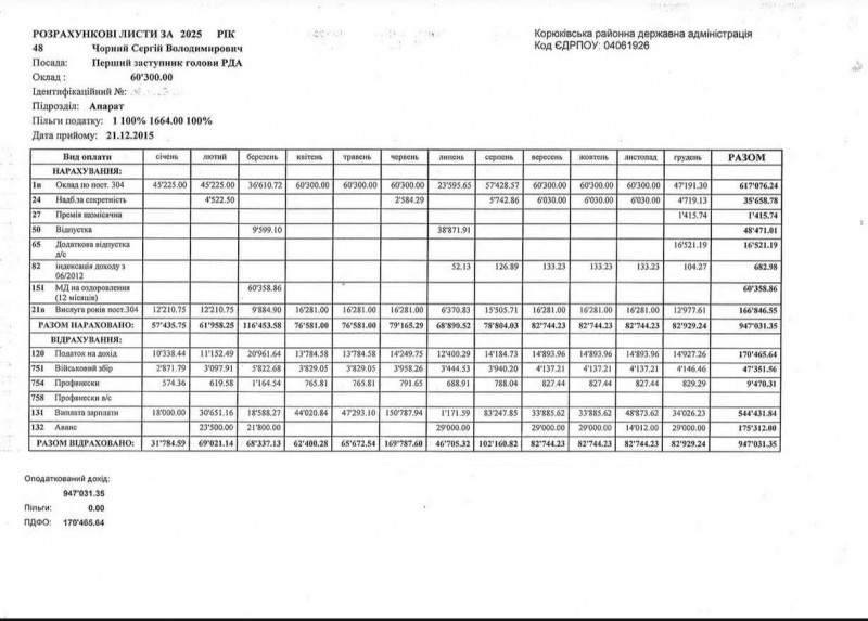 Окрім цього, щомісяця першому заступнику Корюківської РВА нараховували додаткову доплату за вислугу років від 9 884,90 грн до 16 281 грн.