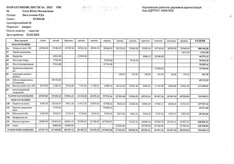 Заступниця голови Корюківської РДА Юлія Сита обіймає посаду з 22 березня 2022 року. За 2025 рік вона заробила 626 512, 91 грн (без ПДВ). Її місячний оклад становив 53 840 грн. У лютому Юлія Сита отримала 49 172, 29 грн (з ПДВ) матеріальної допомоги, окрім цього, заступниця голови Корюківської РДА 4 рази на рік ходила у відпустку, отримуючи за неї виплати від 6 033,08 грн до 21 814,94 грн (з ПДВ).