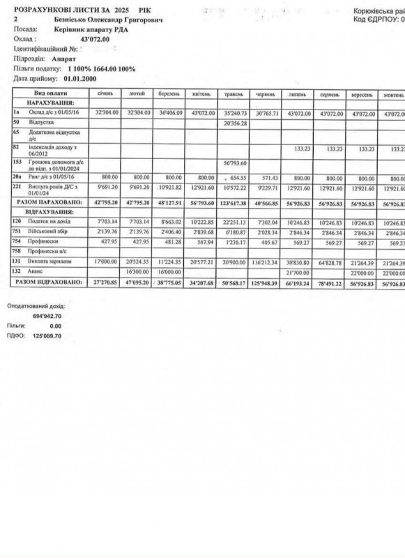 Керівник апарату Корюківської РДА Олександр Безнісько обіймає посаду з 1 січня 2000 року. За минулий 2025 рік Олександр Безнісько заробив 569 853 грн (без ПДВ). Його місячний оклад становив 40 072 грн. Щомісяця чоловік отримував виплату за вислугу років від 9 691,20 грн до 12 921,60 грн (з ПДВ). Найвищу заробітну плату Олександр Безнісько отримав у червні – 116 212,34 грн (з ПДВ). У травні керівник апарату Корюківської РДА отримав виплати за відпустку в розмірі 20 356,28 грн (з ПДВ) та грошову допомогу до відпустки 56 793,60 грн.