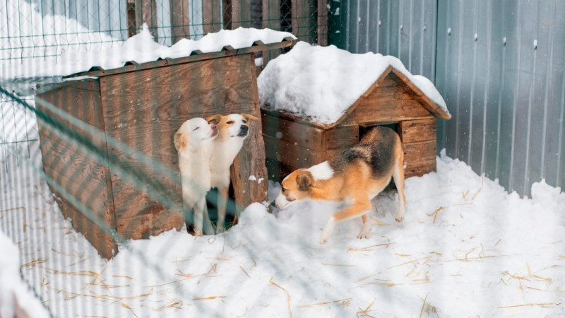Підопічні центру «Крок до тварин» у собачих будках. ФОТО: Анна Барбенюк