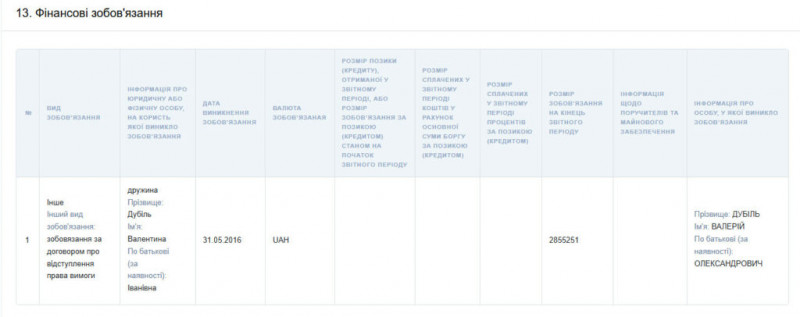 Валерій Дубіль має боргове зобов’язання перед своєю дружиною в розмірі 2 855 251 грн.