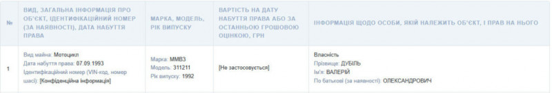 Натомість Валерій Дубіль із рухомого майна має лише мотоцикл марки ММВЗ, 1992 року випуску (мотоцикл «Мінськ»).