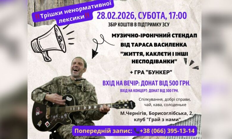 28 лютого в Чернігові відбудеться особливий захід – музично-іронічний стендап від Тараса Василенка, який сам є військовим і збирає гроші на потреби ЗСУ.