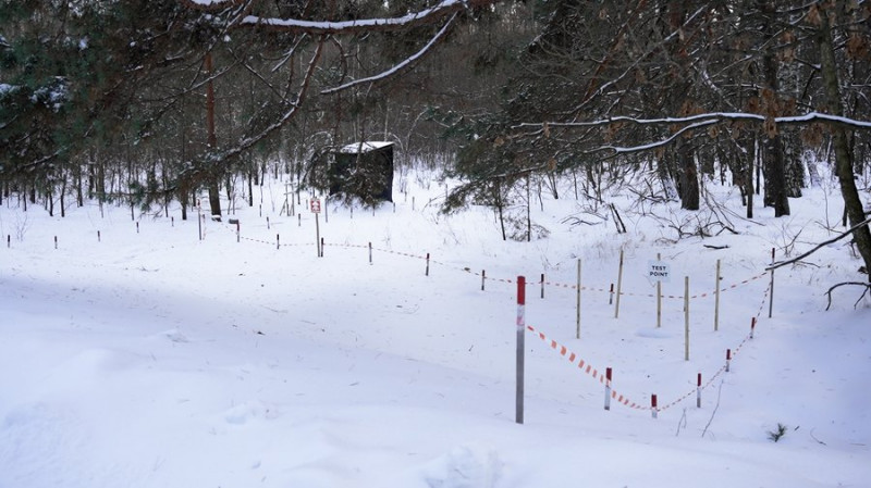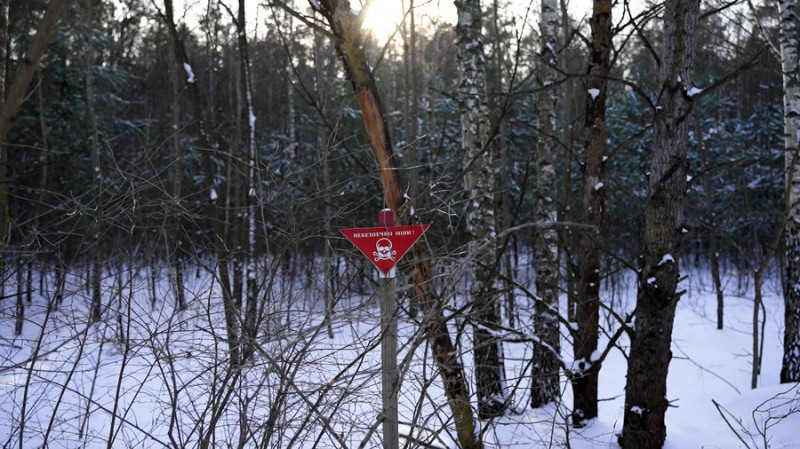 Промаркована для розмінування ділянка на Чернігівщині. Суспільне Чернігів"Досі діє заборона на відвідування лісів, пересування ґрунтовими дорогами тощо. Але люди все одно йдуть. Десь метрів за 300 звідси теж людина вирішила назбирати грибів, жіночка літня, вона жива. Була помаркована територія, не зважаючи на це, вона вирішила назбирати і, на жаль, була поранена. Також на розтяжці стояла граната РГД-5".