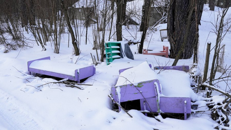 Дитячі меблі біля будівлі школи в селі Ягідне на Чернігівщині. Суспільне Чернігів