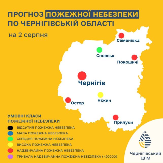 Завтра, 2 серпня, на території Чернігівщини очікується надзвичайна пожежна небезпека. Підвищення температури повітря та бездощова погода призводить до високої ймовірності виникнення та швидкого розповсюдження лісових пожеж за наявності джерел займання.