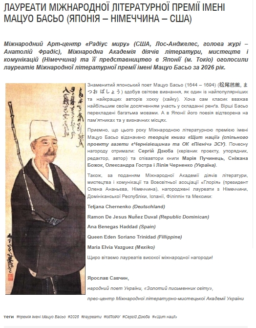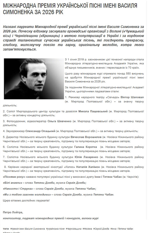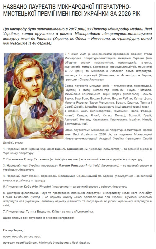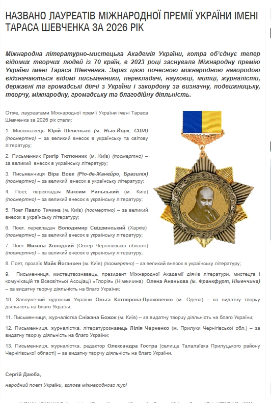 Велика дяка Міжнародній літературно-мистецькій Академії України (президент наш чернігівський земляк Сергій Дзюба) за чудові медалі та дипломи, які вже мають на всіх континентах тисячі «Золотих письменників світу». Завдяки цій енергійно-творчій установі українська класика активно інтегрується у світовий контекст. Генії, які визначили обличчя української поезії ХХ століття, нарешті дочекалися ще й міжнародного визнання.