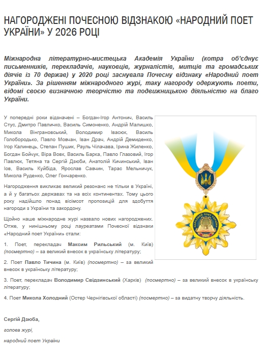 Є щось зворушливе в тому, як сучасні нагороди розширюють часові горизонти. Павло Тичина, Максим Рильський, Василь Симоненко, Микола Холодний – постаті, які давно стали частиною історії, – раптом знову повертаються в інформаційний простір як свіжоспечені «народні поети України» і водночас лауреати міжнародних відзнак!!! Вони, так би мовити, проходять процедуру «свіжої реєстрації».