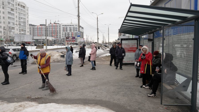 Люди на зупинці громадського транспорту в мікрорайоні Масани у Чернігові 2 березня 2026 року. Суспільне Чернігів