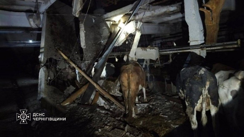 Корови у пошкодженому внаслідок атаки РФ корівнику на Чернігівщині 22 березня 2026 року. В’ячеслав Чаус"Сьогодні вночі «Герані» вдарили по селу в Корюківському районі. Мішенню стало сільгосппідприємство. Агресор вдарив по корівнику — одна корова загинула. Пожежу на місці удару загасили вогнеборці", — йдеться у повідомленні.