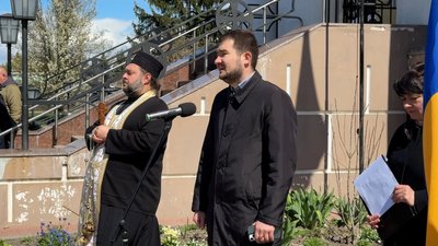 Віктор Денисенко біля мікрофона на церемонії прощання з Яною Шкарлат. Суспільне Чернігів