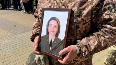 Тетяна Коваленко біля мікрофона на церемонії прощання з Яною Шкарлат. Суспільне Чернігів