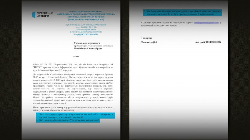 Журналісти Суспільного надіслали інформаційний запит до управління державного архітектурно-будівельного контролю міської ради, аби дізнатися, хто погоджував проєктну документацію, хто приймав цей об’єкт та чи перевіряли тоді наявність усіх необхідних конструкцій, зокрема зливової каналізації. Також ми намагалися отримати коментар від компанії "КомфортБудПлюс", яка зводила цей корпус. За номером телефону, який вказаний на їхньому офіційному сайті, відповіла жінка, яка не представилася, та сказала, що питання про ливнівку — не до них, бо вони передали цей об’єкт іншій юридичній особі. Вона надала номер цієї особи і сказала звертатися за коментарем туди. За тим номером телефону нам відповів чоловік і сказав, аби всі питання ставили тому, хто будував цю багатоповерхівку.