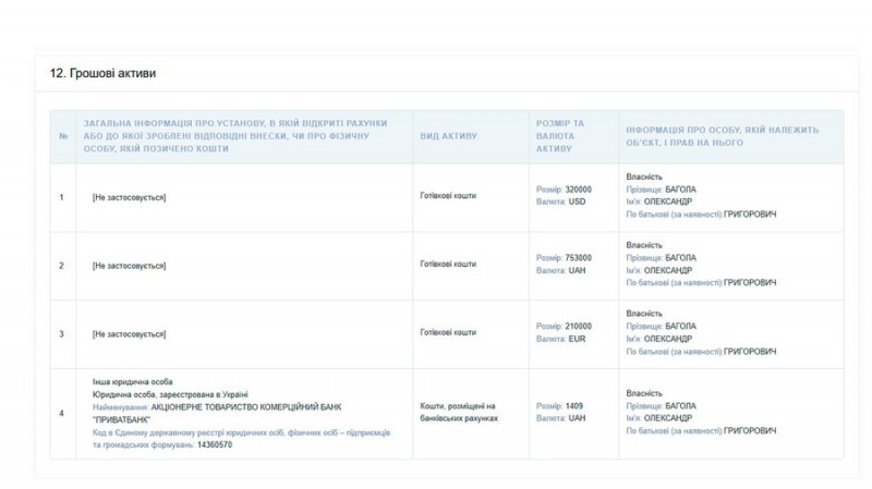 Скрин із декларації Олександра Баголи. Суспільне Чернігів