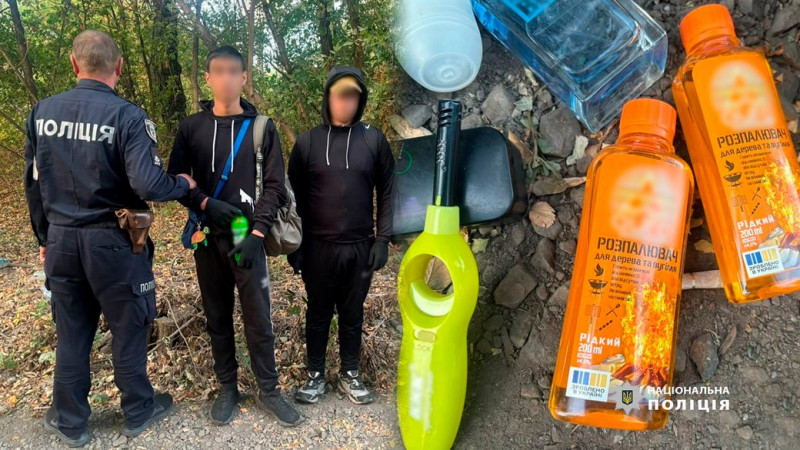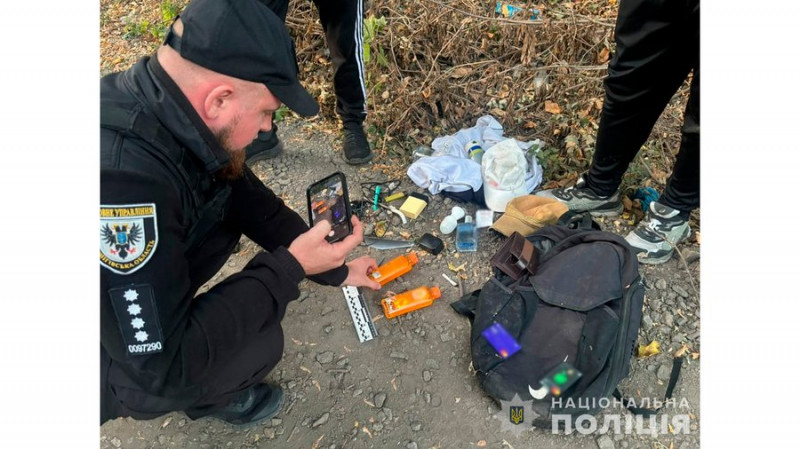 Момент затримання підлітків, підозрюваних у підпалі релейних шаф на залізниці та запальні суміші, які вони використовували 14 жовтня 2024 року. Поліція Чернігівської області